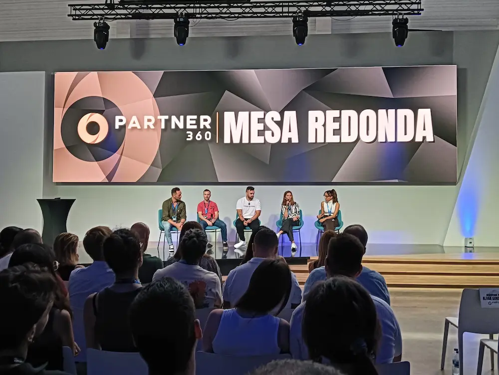 Uno de los momentos más cercanos de la mañana fue la mesa redonda. En el escenario se sentaron Fabio Serna, Álvaro, Sergio, acompañados por Anna y Erika, todos ellos exalumnos que hoy forman parte del equipo de Partner 360.